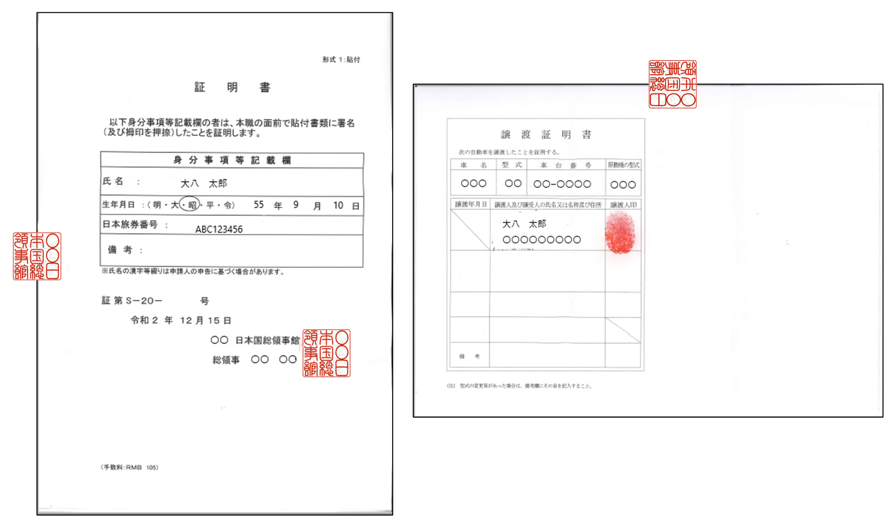 通常、お車の抹消手続きをする際は印鑑証明書と委任状と譲渡証が必要になりますが海外へ出張されている方は印鑑証明書が取得できない為に代わりにサイン証明書が必要になります。