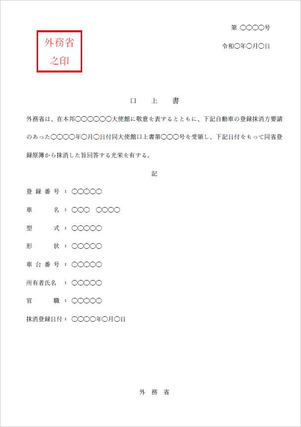 大使館(外務省)ナンバーの自動車を廃車する場合